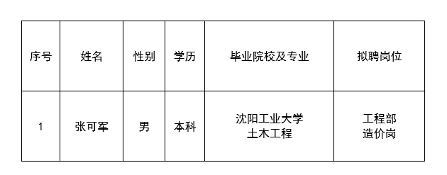 因公司發(fā)展需要,承德市國越房地產(chǎn)開發(fā)有限公司委托第三方機構(gòu)面向社會公開工程部造價崗員工1名。現(xiàn)對擬錄用人員信息進行公示,公示期間如有異議,可通過電話、信函等方式反映,反映意見請署真實姓名。