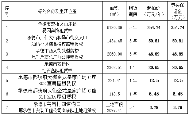我集團(tuán)全資子公司承德市國控資產(chǎn)運(yùn)營有限公司、承德市國瑞物業(yè)管理有限公司委托河北福成拍賣有限公司,定于2020年1月21日上午9時(shí)在承德市雙橋區(qū)武烈路6號(hào)紫御國際假日酒店會(huì)議室公開拍賣下列標(biāo)的,現(xiàn)將有關(guān)事項(xiàng)公告如下: